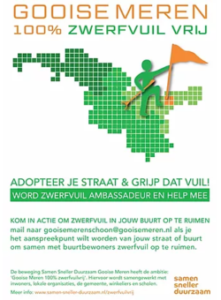 Wil je, niet alleen op de landelijke dag, maar je structureel inzetten om in de wijk zwerfvuil op te ruimen, dan kan je je aansluiten bij de beweging ‘Samen Sneller Duurzaam Gooise Meren’. Hier kan je je opgeven als zwerfvuilambassadeur of je aansluiten bij de ambassadeur in jouw straat of buurt. Je bepaalt zelf wanneer je meehelpt en of je daarbij wil aansluiten bij anderen. Ook in Parkwijk Naarden zijn inmiddels al meerdere ambassadeurs, ze zijn te vinden op de site